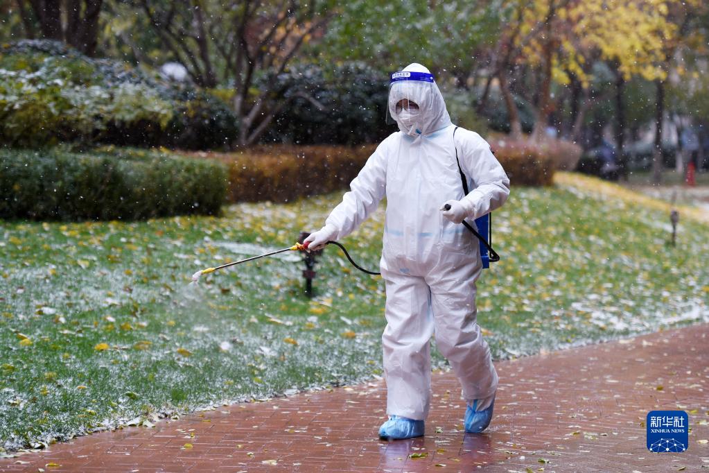 11月6日,在兰州市七里河区仁恒美林郡小区,工作人员在小区内部进行消杀作业。
