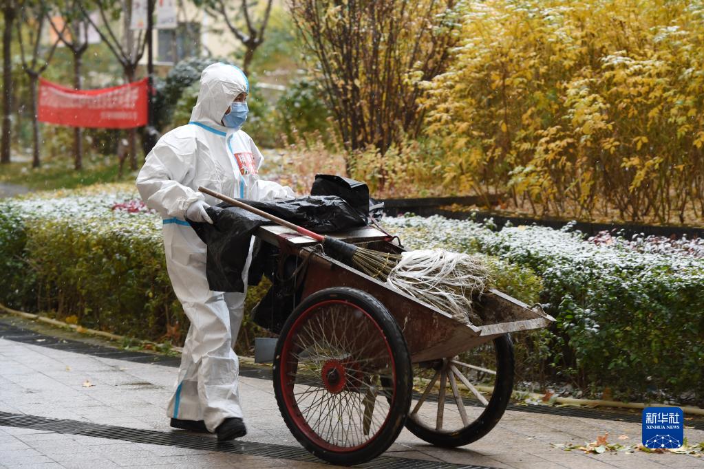 11月6日,在兰州市七里河区光明苑小区,工作人员打扫小区内卫生。