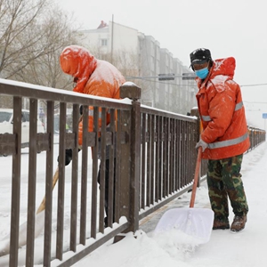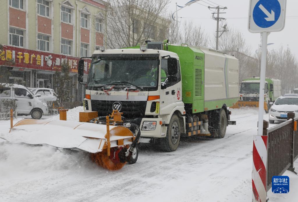 11月6日,康保县的环卫工人驾驶道路清扫车清理县城路面上的积雪。