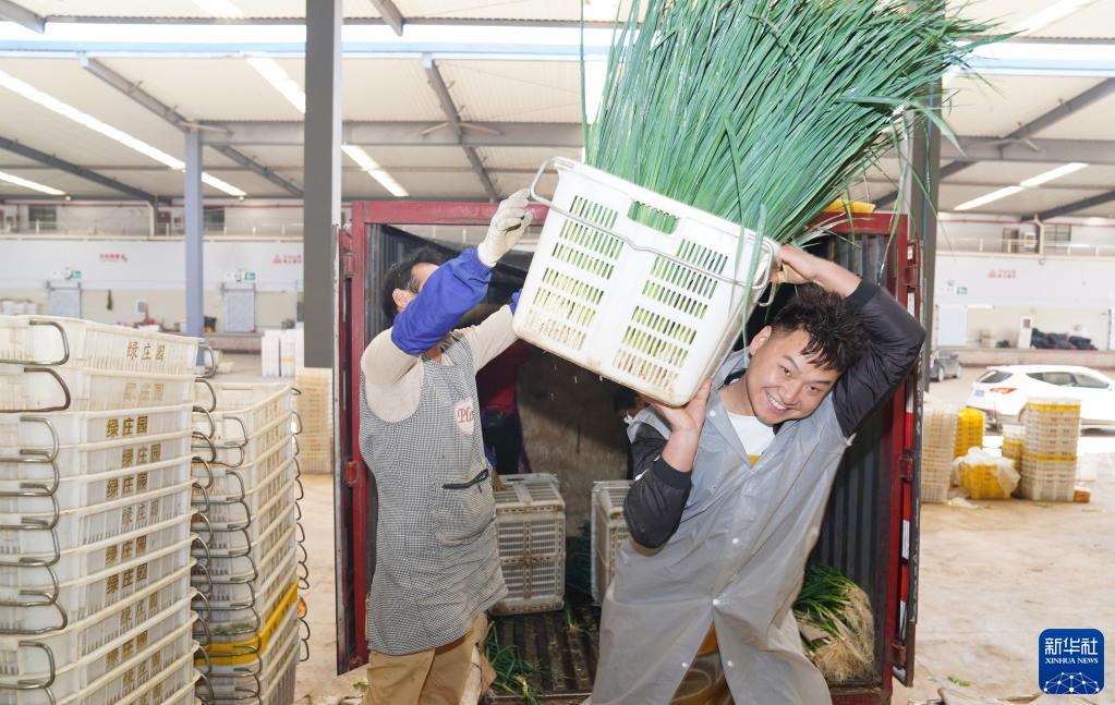11月6日,通海县的菜农在蔬菜批发市场搬运青蒜。