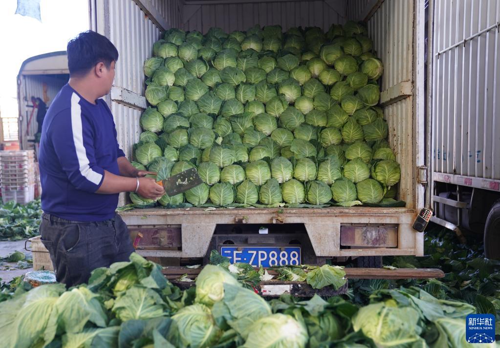 11月6日,通海县的菜农在蔬菜批发市场挑拣包菜。