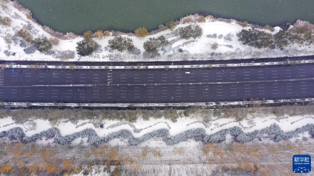 这是11月6日在银川市街头拍摄的雪景(无人机照片)。