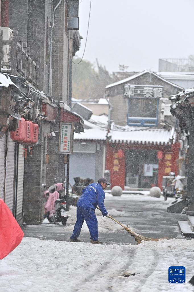 11月7日,什刹海保洁队工作人员在烟袋斜街扫除路面积雪。