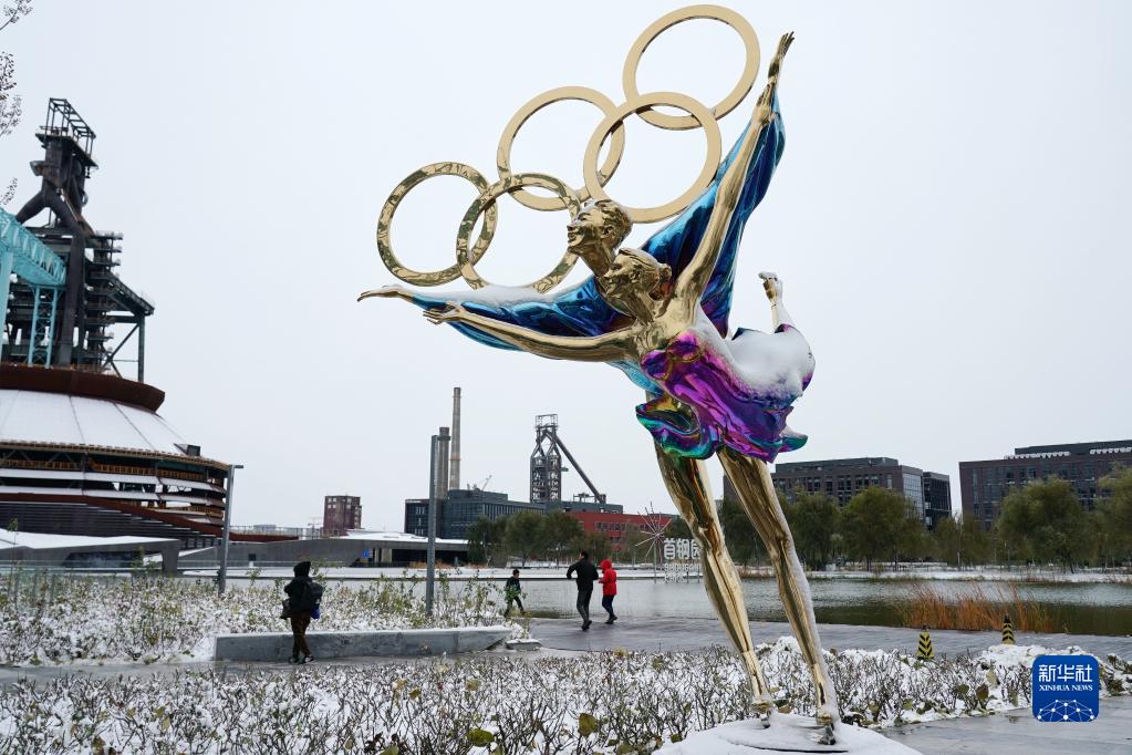 11月7日,游客在首钢园游玩赏雪。
