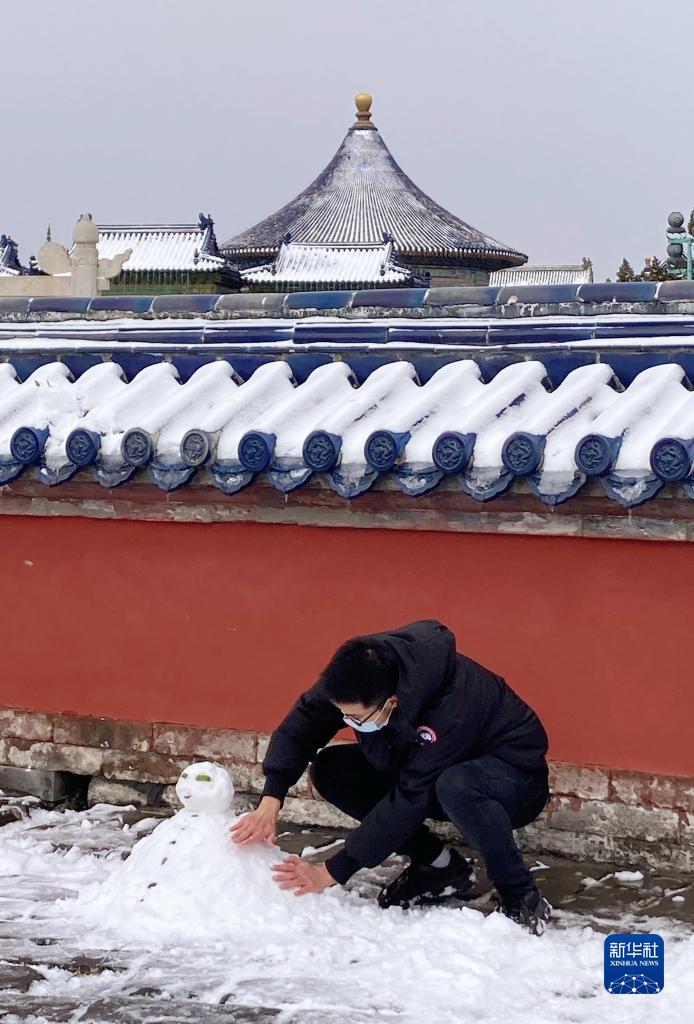 11月7日,游客在天坛公园堆雪人。