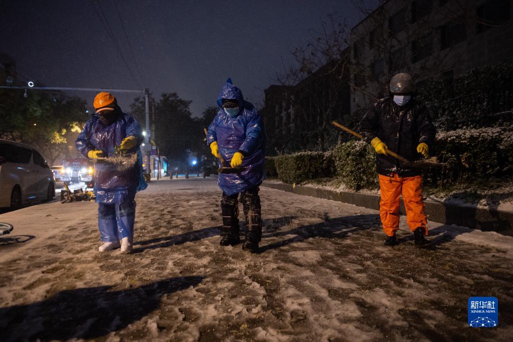 11月6日晚,在东城区交道口东大街,环卫工人在清扫积雪。