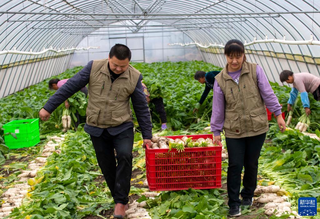 11月7日,在位于泰州市胡庄镇的江苏省“菜篮子”工程永久性蔬菜生产基地,胡庄镇汪群社区网格员帮助菜农运送萝卜。