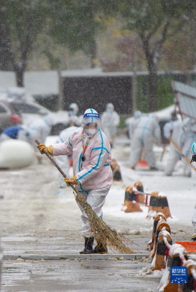 11月7日,在处于封控管理下的北京市昌平区天通北苑第二社区,环卫工人在清扫积雪。