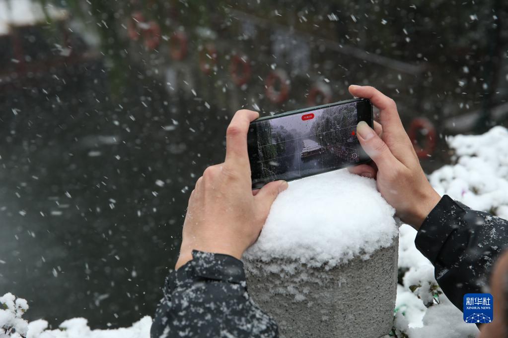 11月7日,市民在山东济南环城公园拍摄雪景。
