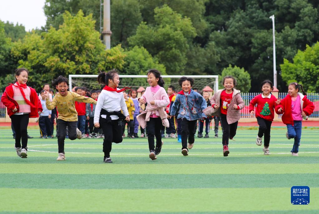 11月4日,在湖南省永州市新田县双碧小学,孩子们在运动场上做游戏。今年秋季学期开学以来,各地积极落实“双减”政策,利用课后服务时间开展内容丰富、形式多样的课外活动,促进学生全面发展。