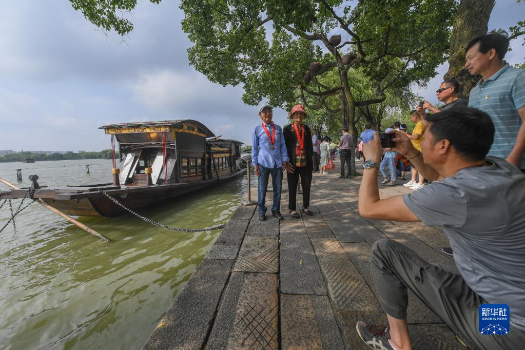两名老党员在浙江嘉兴南湖湖心岛停泊的南湖红船旁拍照留影(7月1日摄)。