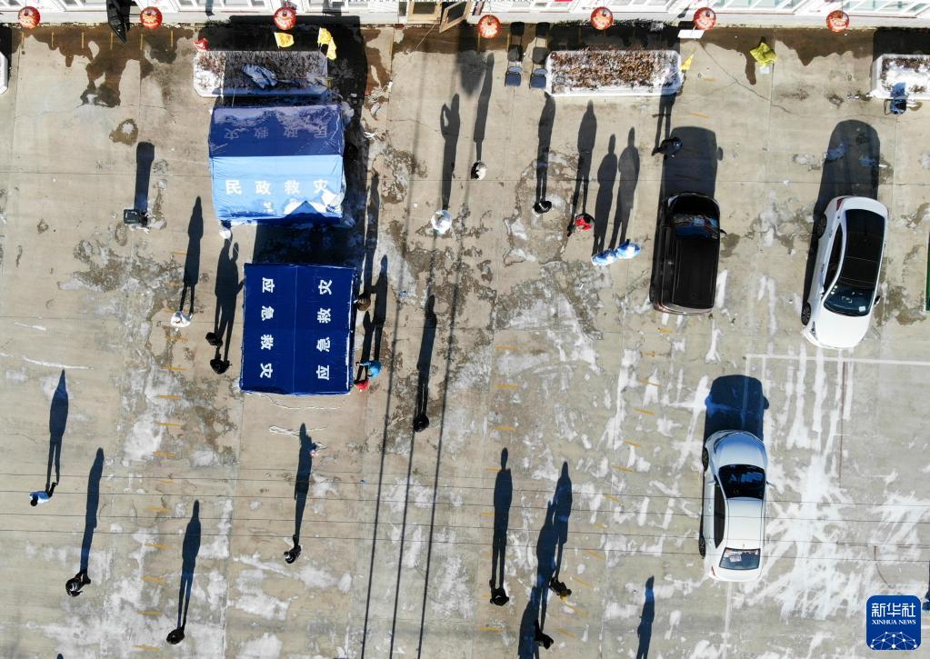 11月7日,村民在黑河市爱辉区幸福乡河南屯村村委会进行核酸检测(无人机照片)。