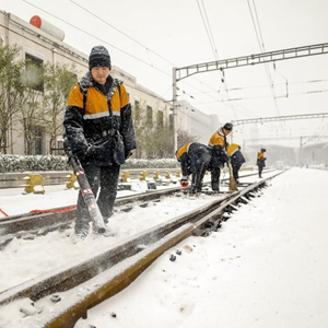 11月7日,天津工务段职工在清理铁路线上的积雪。当日,中国铁路北京局集团有限公司天津工务段组织干部职工清扫积雪,排查设备隐患,确保铁路运输线设备安全稳定。新华社发(李佳骏 摄)