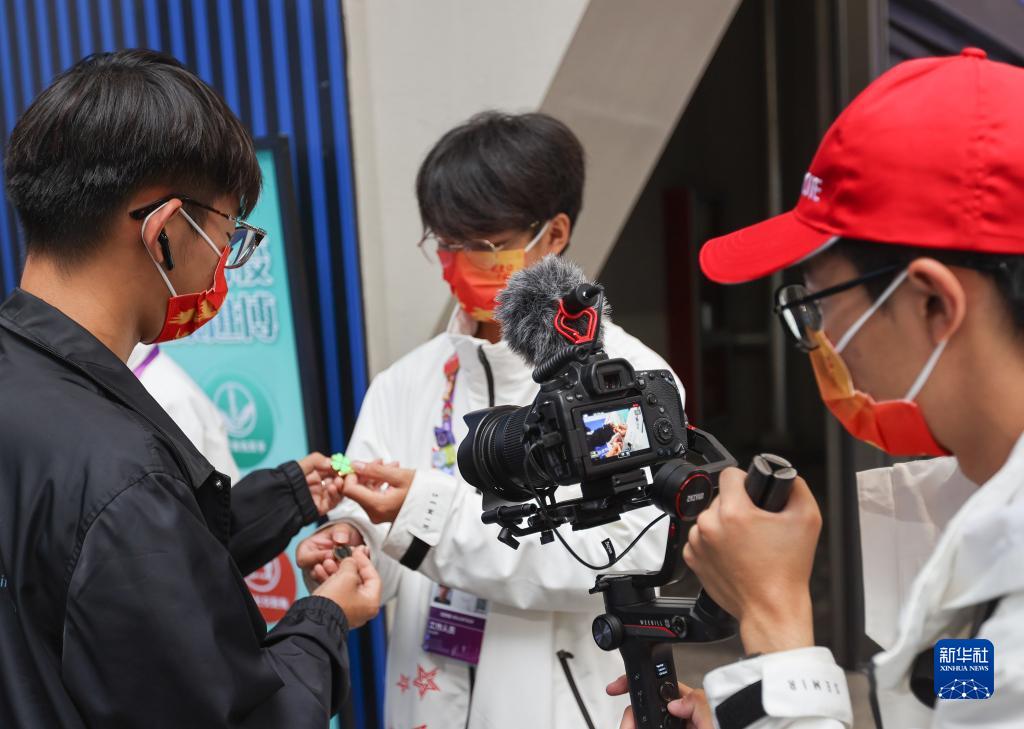 11月7日,“小叶子”体验官(右)在拍摄“小叶子”(中)和朋友交换徽章。