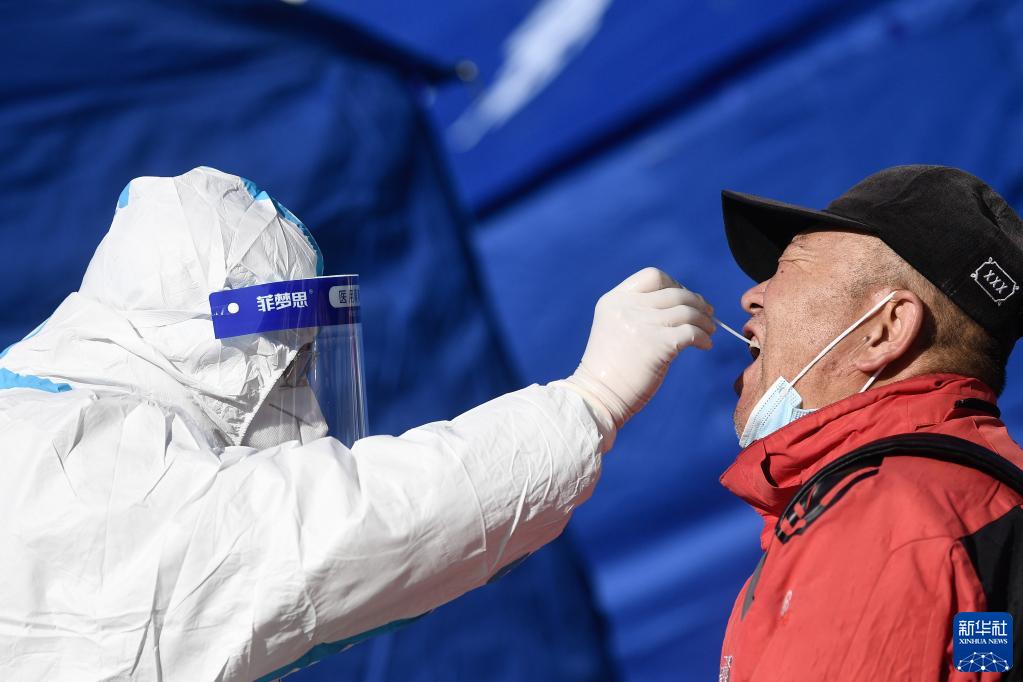 11月8日,在青海省西宁市城西区宝丰绿洲采样点,医护人员为市民进行核酸采样。