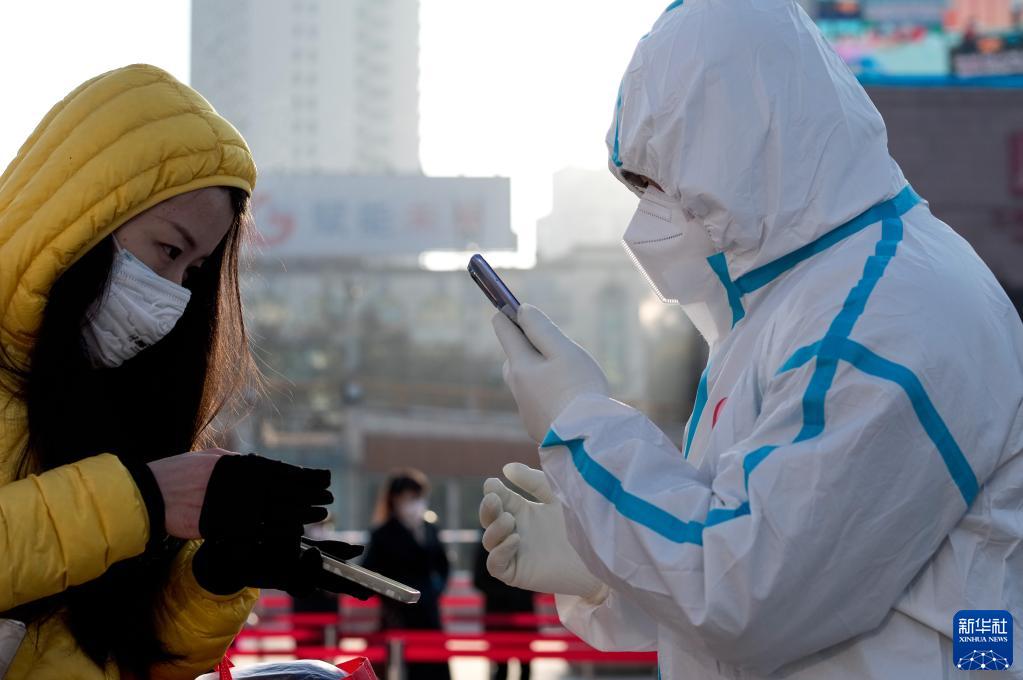 11月8日,在西宁市中心广场核酸采样点,工作人员为群众扫码登记。