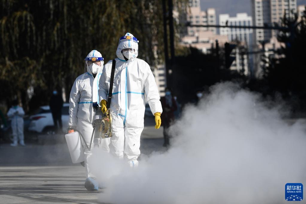 11月8日,在青海省西宁市城西区海湖体育中心采样点,工作人员对采样区域消杀。