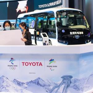 11月7日在第四届进博会汽车展区丰田展台拍摄的的“冰墩墩”和“雪容融”。