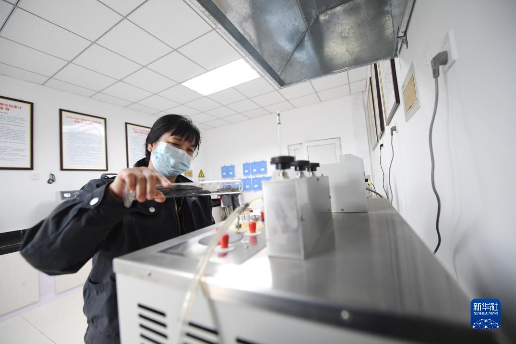 11月8日,中建路桥集团中心试验室工作人员在原材料试验室进行沥青检测。