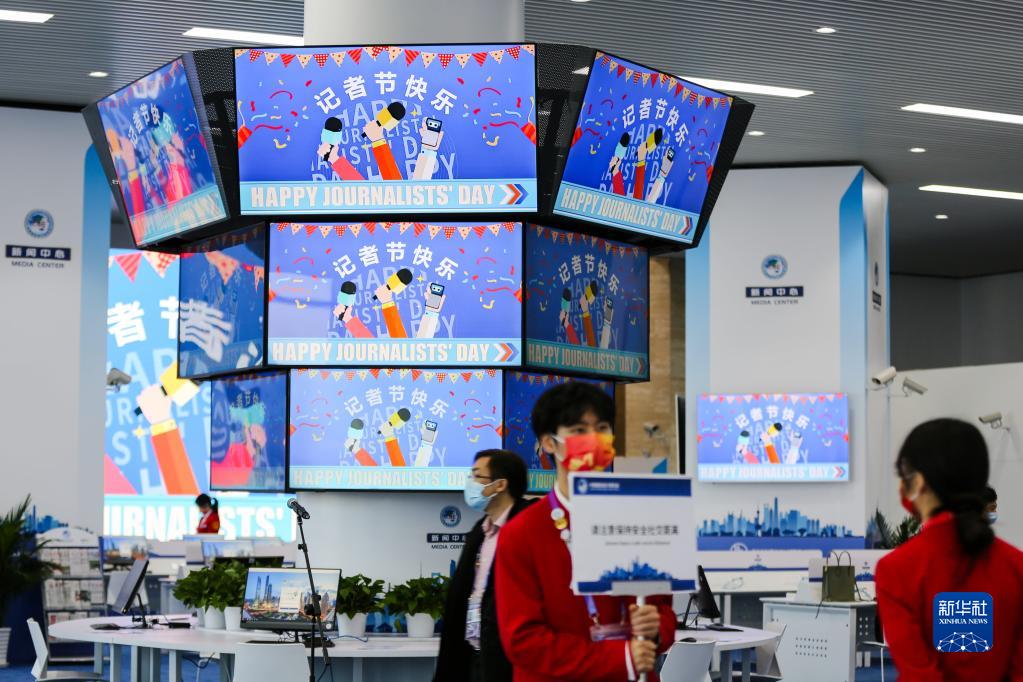 当日是第22个中国记者节,正在上海报道第四届进博会的记者们在忙碌的工作中度过节日。