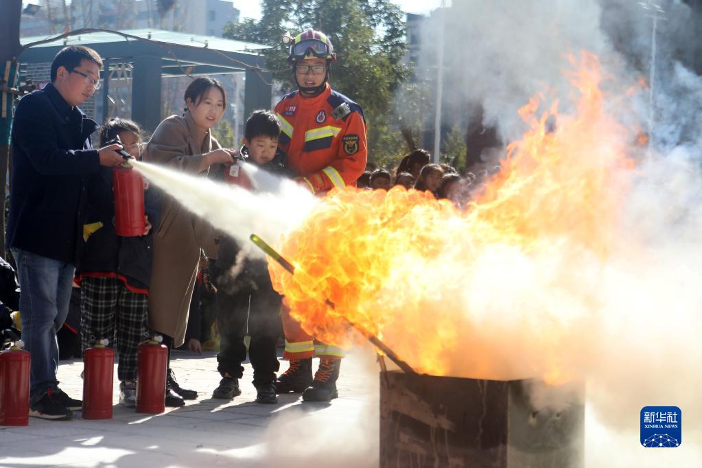 11月8日,在安徽省淮北市泉山路学校,师生们在消防员的指导下学习灭火技能。