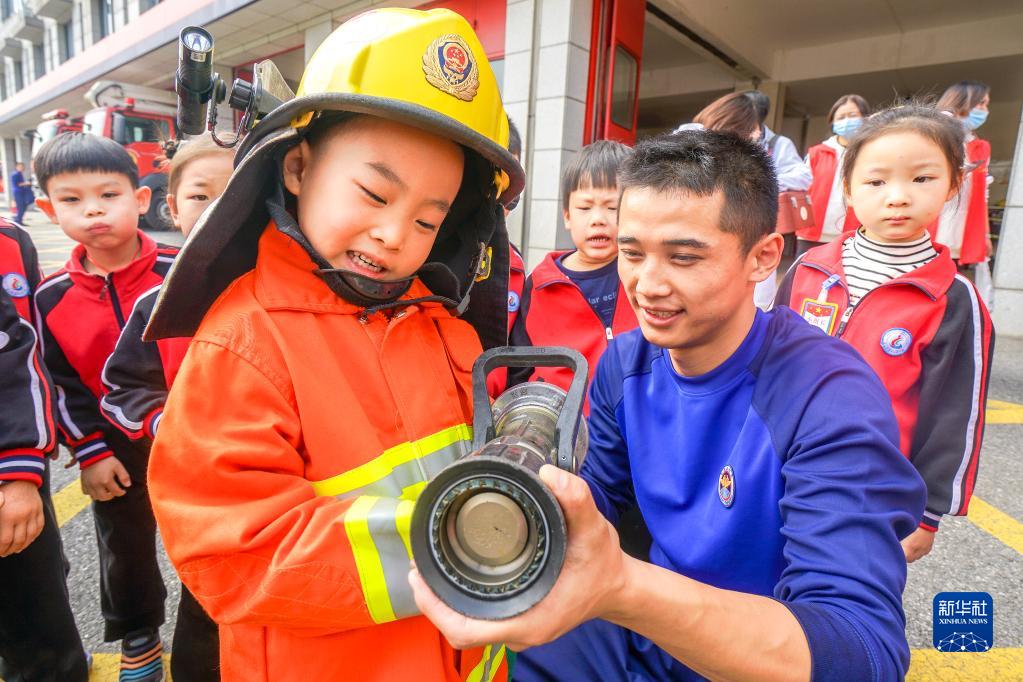 11月8日,浙江省湖州市长兴县龙山街道中心幼儿园的小朋友穿上消防服体验消防水枪。