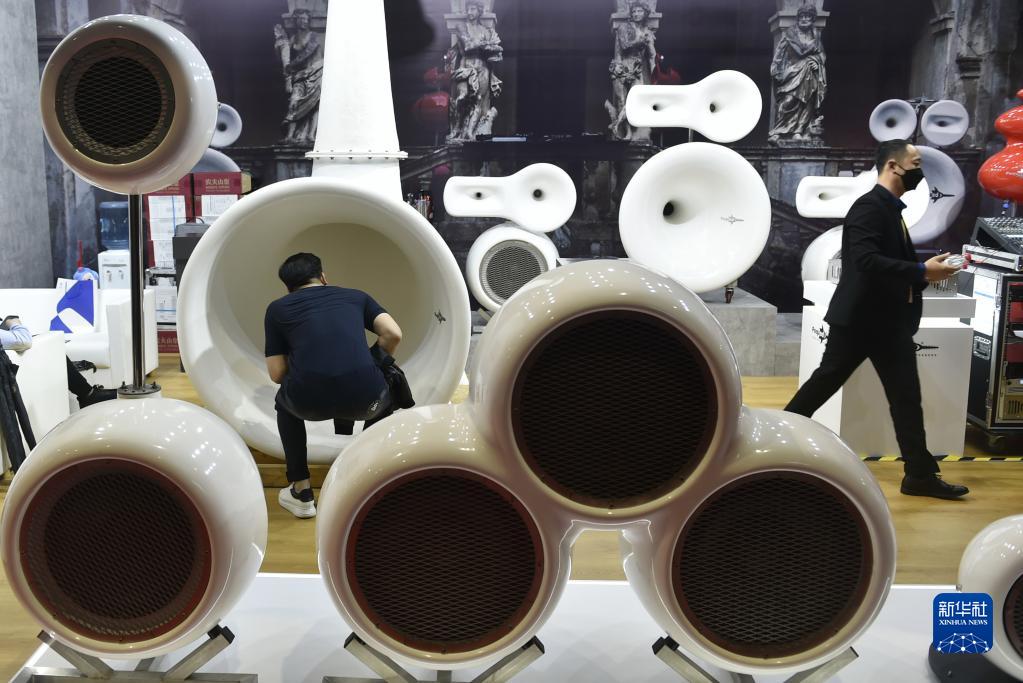 11月6日,参会者在第四届进博会展馆里的意大利PEQUOD公司展位参观音响设备。PEQUOD公司首次参展进博会。