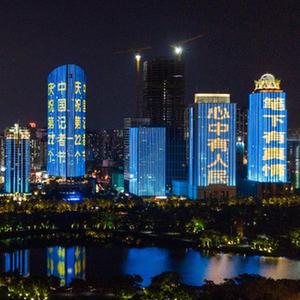 当日,海口滨海大道部分高层建筑亮起景观灯,打出“心中有人民”和“笔下有真情”等字样,庆祝第22个中国记者节。