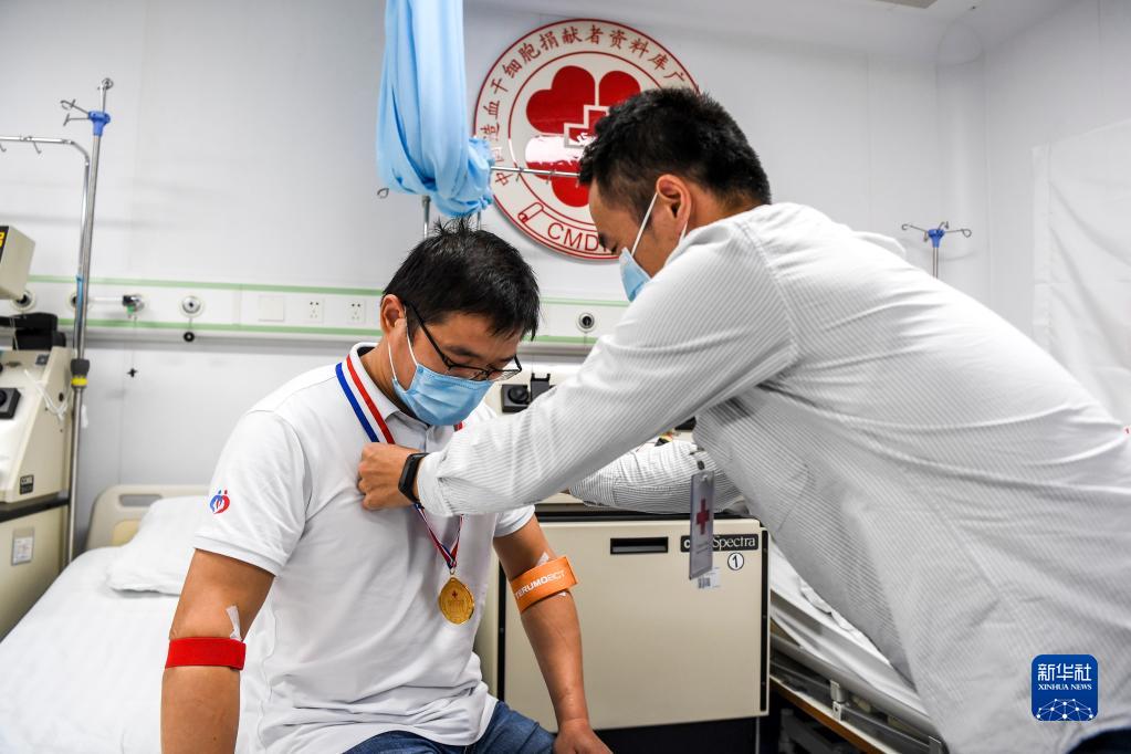 在广西医科大学第一附属医院,工作人员为造血干细胞捐献者李医生(左)戴上奖章(2021年11月摄)。