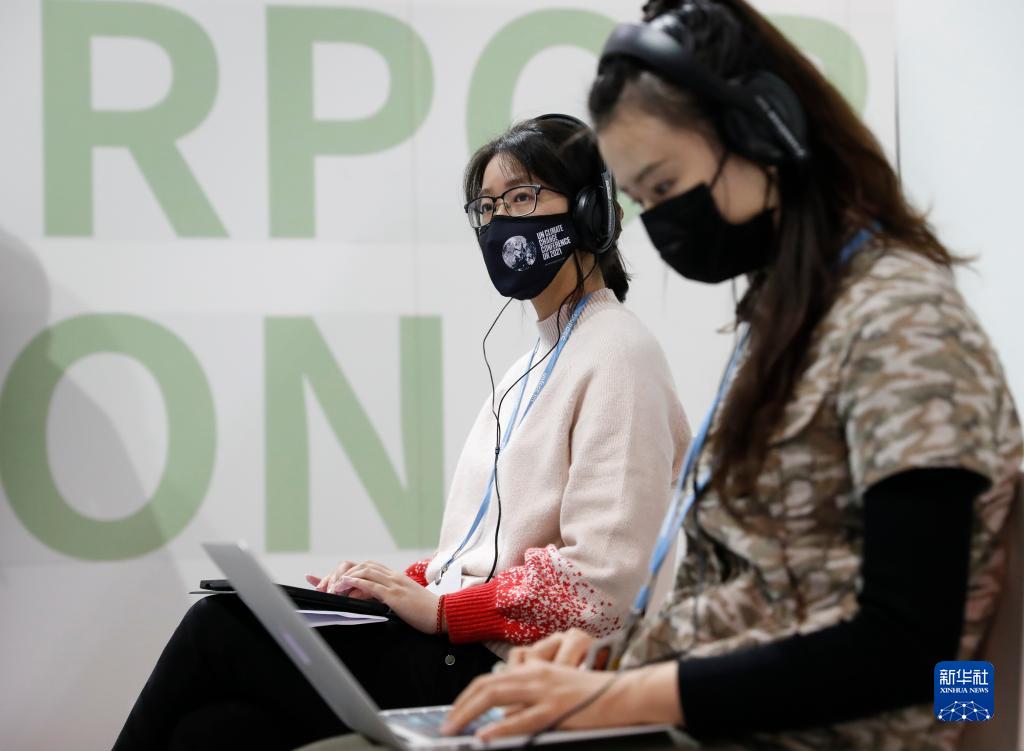 11月4日,在英国格拉斯哥联合国气候变化大会中国企业馆,志愿者张如苑(左)在做会议记录。张如苑是来自帝国理工学院流行病专业的硕士毕业生。本次大会期间主要负责布置会场、前台接待、会议记录、新闻稿撰写等。
