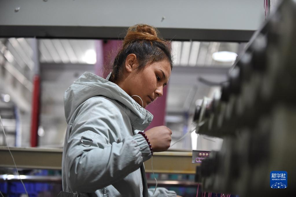 在岳普湖县包装材料产业园,一位工人为生产编织袋准备物料(11月8日摄)。