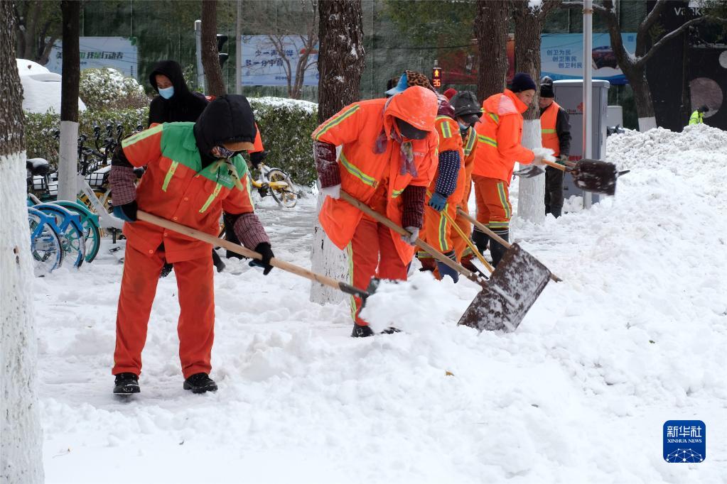 11月8日,环卫工人在清扫道路上的积雪。