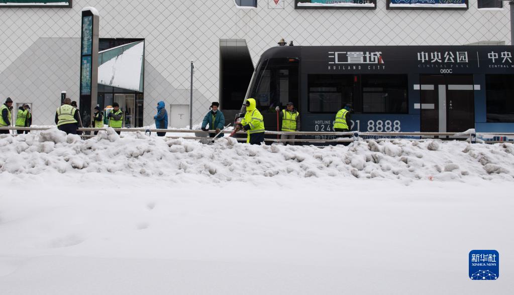 11月9日,在沈阳市浑南区,环卫工人在一辆有轨电车旁清理积雪。