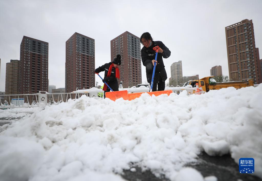 11月9日,工作人员在高速公路沈阳站出入口除雪。