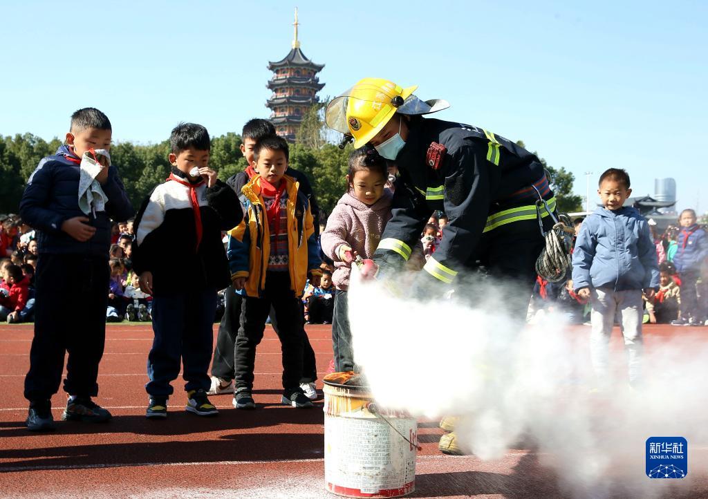 11月9日,在江苏镇江句容市华阳中心小学,一名学生在消防救援人员的指导下学习使用灭火器。