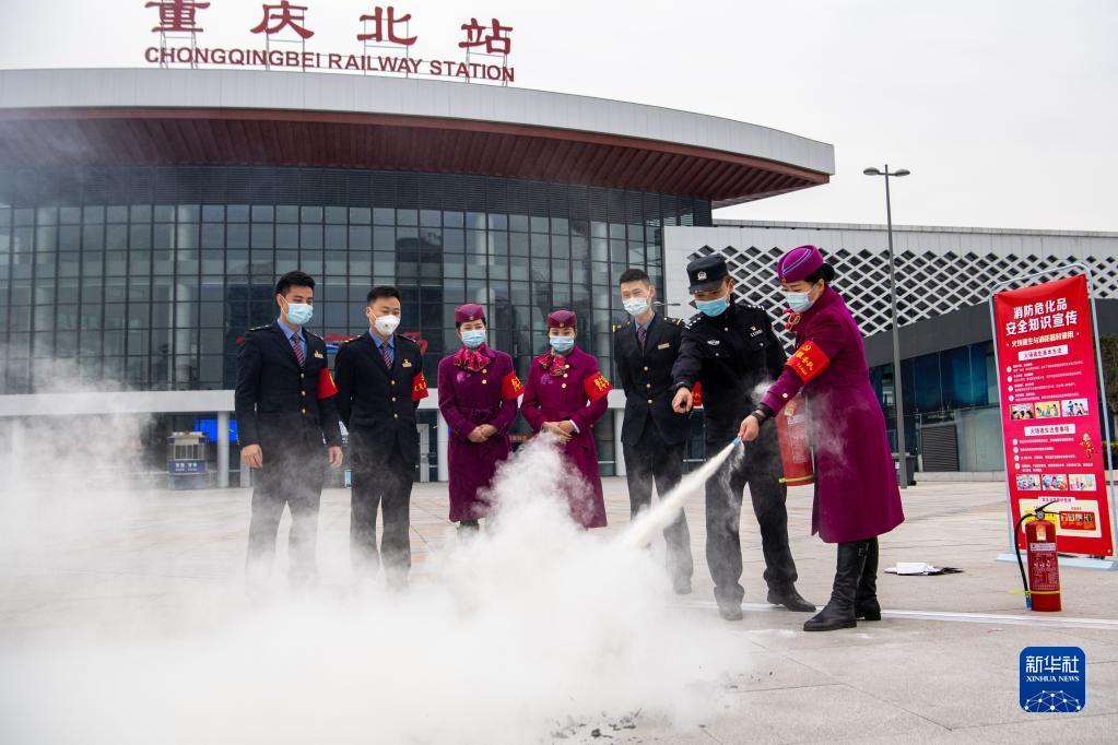 11月9日,在重庆北站南广场,铁路工作人员在重庆铁路公安处民警的指导下使用灭火器“灭火”。