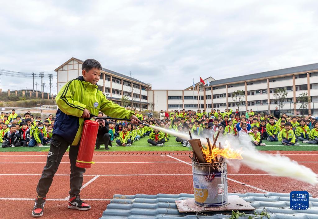 11月9日,贵州省黔西市锦绣学校学生在学习使用灭火器灭火。