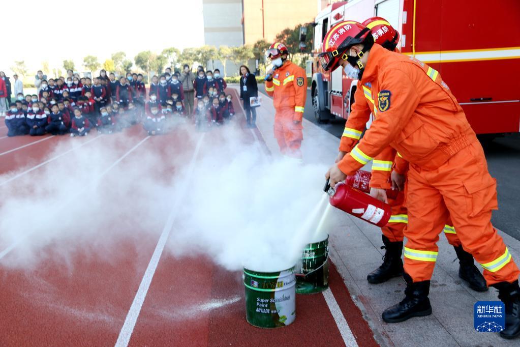 11月9日,江苏省连云港市连云区消防救援大队消防员为学生们演示现场灭火。