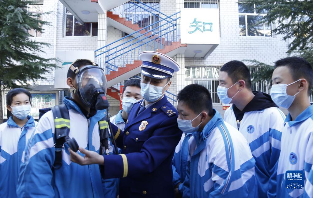 11月9日,河北省邢台市第七中学学生在消防员的指导下了解如何使用消防器材。