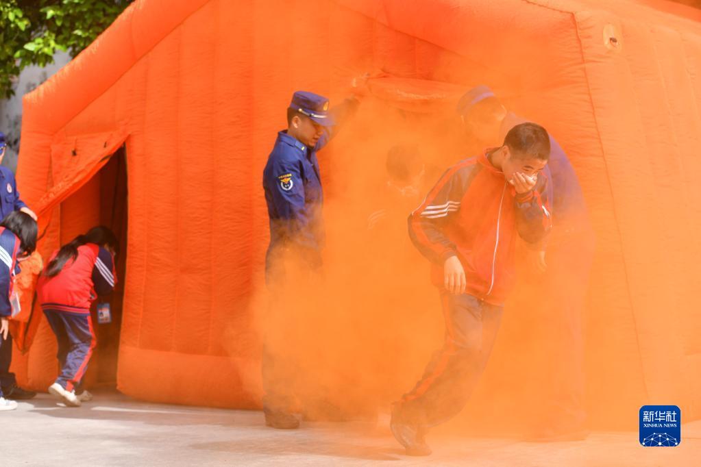 11月9日,在贵州省黄平县重安中学,县消防救援大队组织开展消防安全演练。