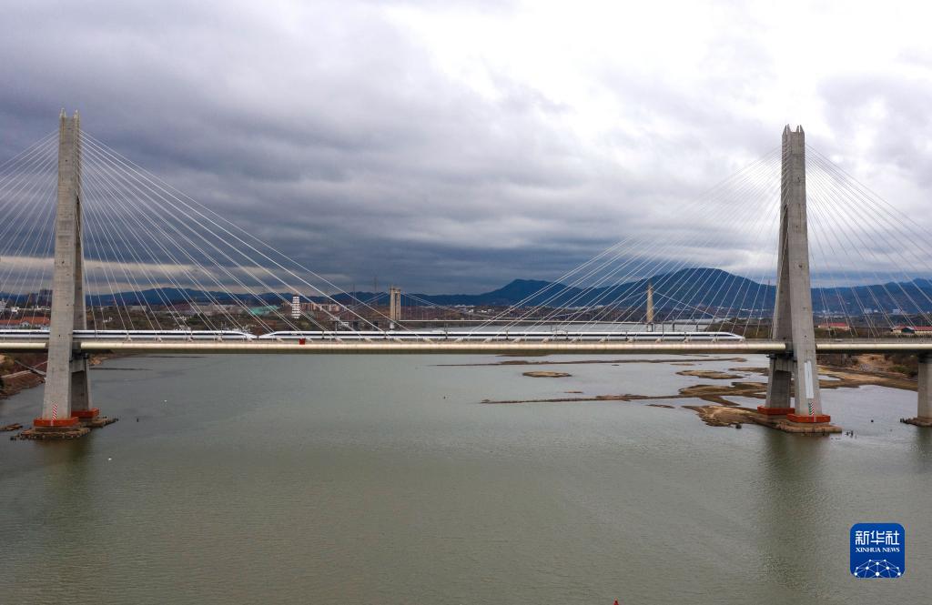 由南昌西站开往赣州西站的G5033次列车通过昌赣高铁赣州赣江特大桥(2019年12月26日无人机拍摄)。