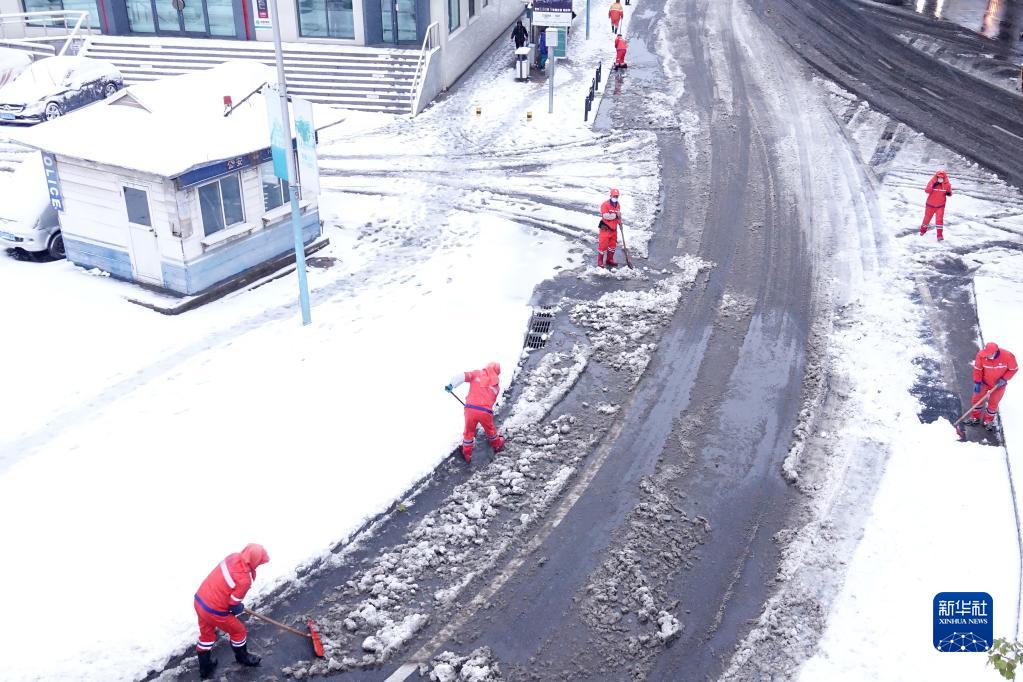 大连市环卫工人在清扫路面积雪(11月8日摄)。