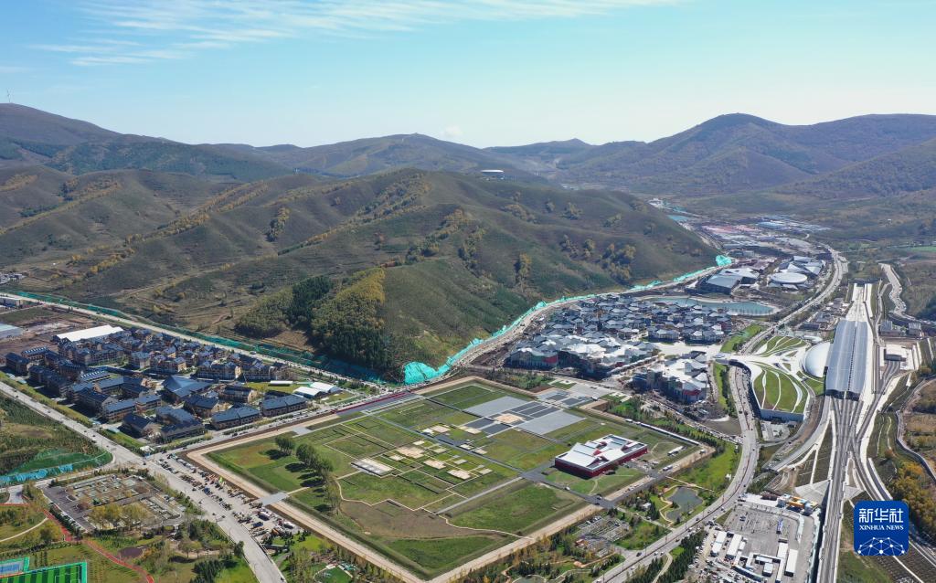 这是9月27日拍摄的奥运村(左)、太子城冰雪小镇(中)和高铁太子城站(无人机照片)。