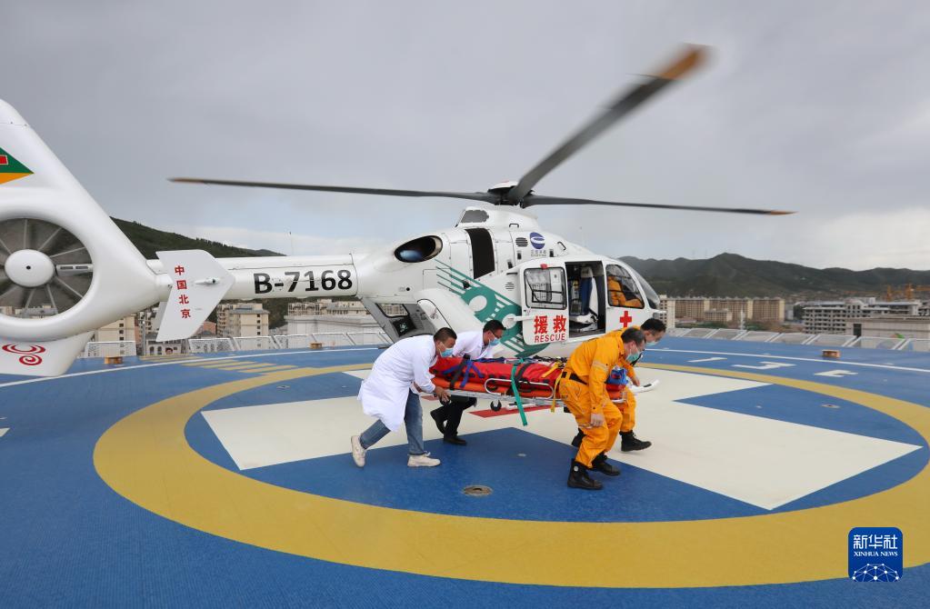 这是医务人员在北医三院崇礼院区的停机坪上进行病患转运演练(2020年8月26日摄)。