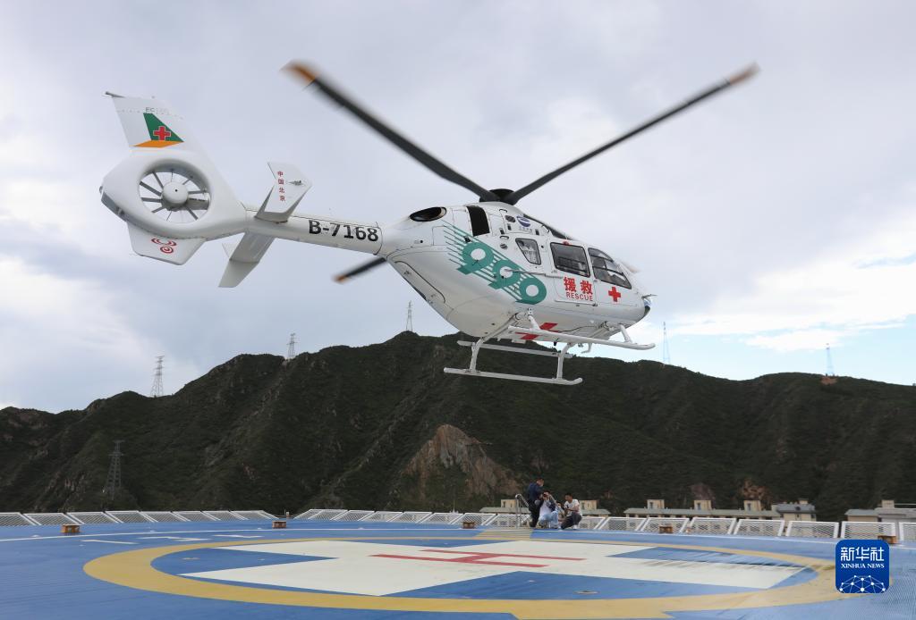 这是参加救援演练的直升机从北医三院崇礼院区的停机坪上起飞(2020年8月26日摄)。