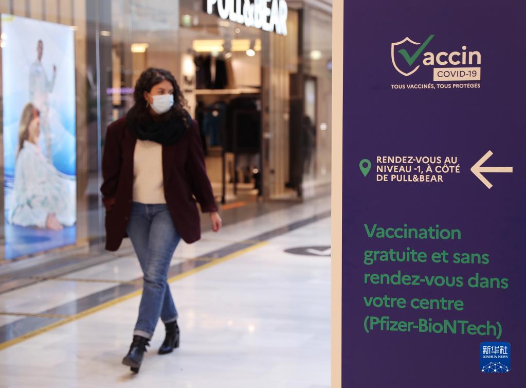 11月9日,在法国巴黎近郊勒瓦卢瓦-佩雷一家购物中心,顾客经过新冠疫苗接种点的指示牌。