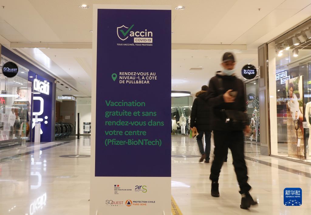11月9日,在法国巴黎近郊勒瓦卢瓦-佩雷一家购物中心,顾客经过新冠疫苗接种点的指示牌。