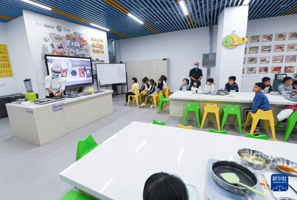 11月9日,在广东佛山顺德的西山小学“西山厨神培训中心”,烹饪老师向一、二年级学生教授如何制作玉米羹。新华社记者 毛思倩 摄