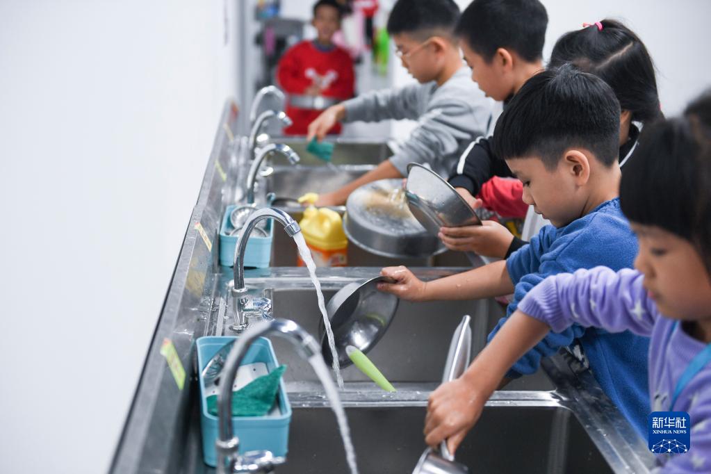 11月9日,在广东佛山顺德的西山小学“西山厨神培训中心”,一、二年级学生在烹饪课上清洗碗盘。新华社记者 毛思倩 摄