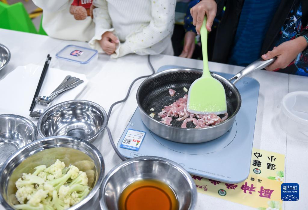 11月9日,在广东佛山顺德的西山小学“西山厨神培训中心”,一、二年级学生学习如何烹饪肉丝炒花菜。新华社记者 毛思倩 摄